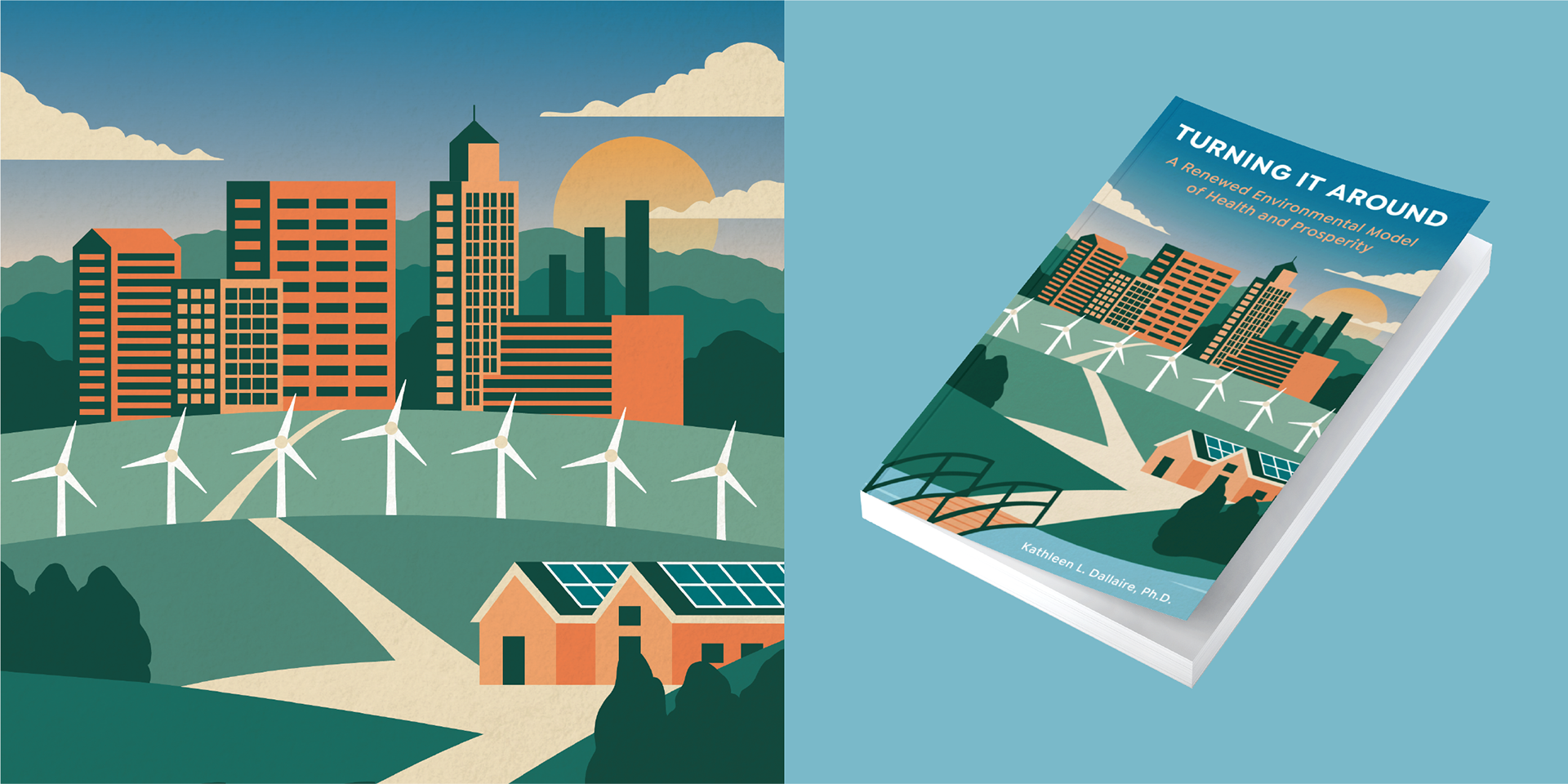 An entrepreneur overseeing environmental projects for over twenty years came to us looking for an illustrated cover design for her book “Turning it Around: A Renewed Environmental Model of Health and Prosperity.” We illustrated a cover that reflected the book’s message about a renewed environmental model of healthy conditions and prosperity as a common goal.